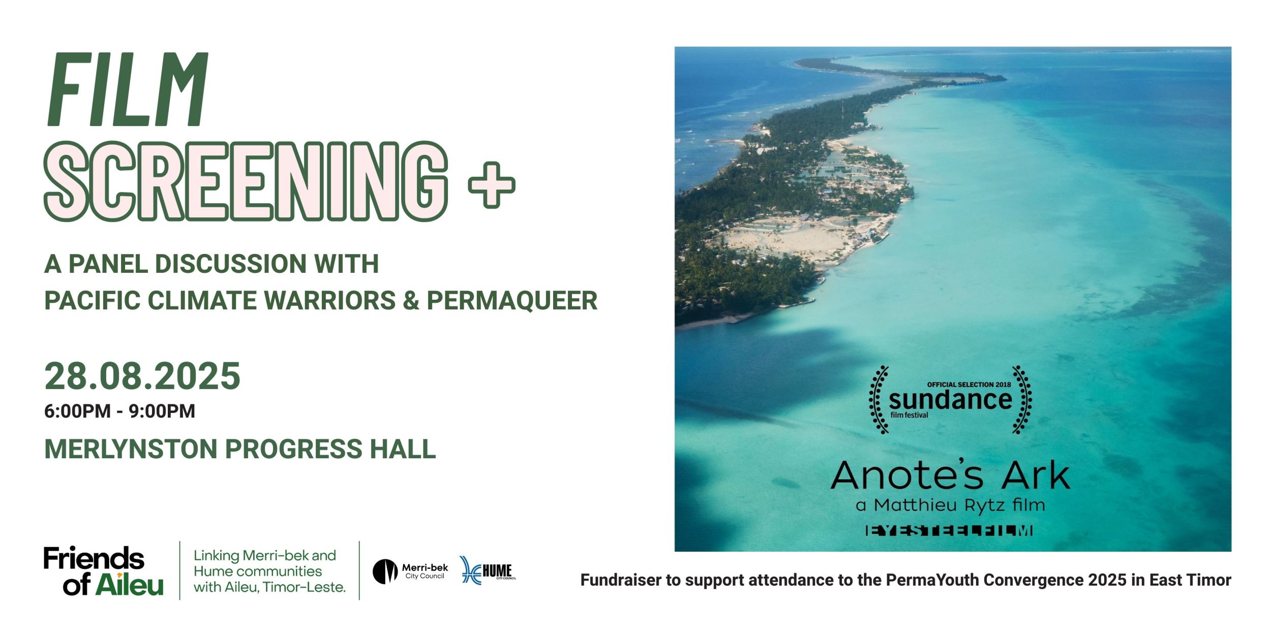 Join Friends of Aileu for an inspiring evening at Merlynston Progress Hall for a screening of the powerful documentary Anote’s Ark, followed by a panel discussion. This moving film follows the story of Kiribati’s struggle against rising sea levels caused by climate change — interweaving the international advocacy of former President Anote Tong with the personal journey of Sermary Tiare, a young mother confronting the reality of displacement. It’s an intimate and urgent portrait of the human faces of the climate crisis and the cultural loss threatening entire nations.